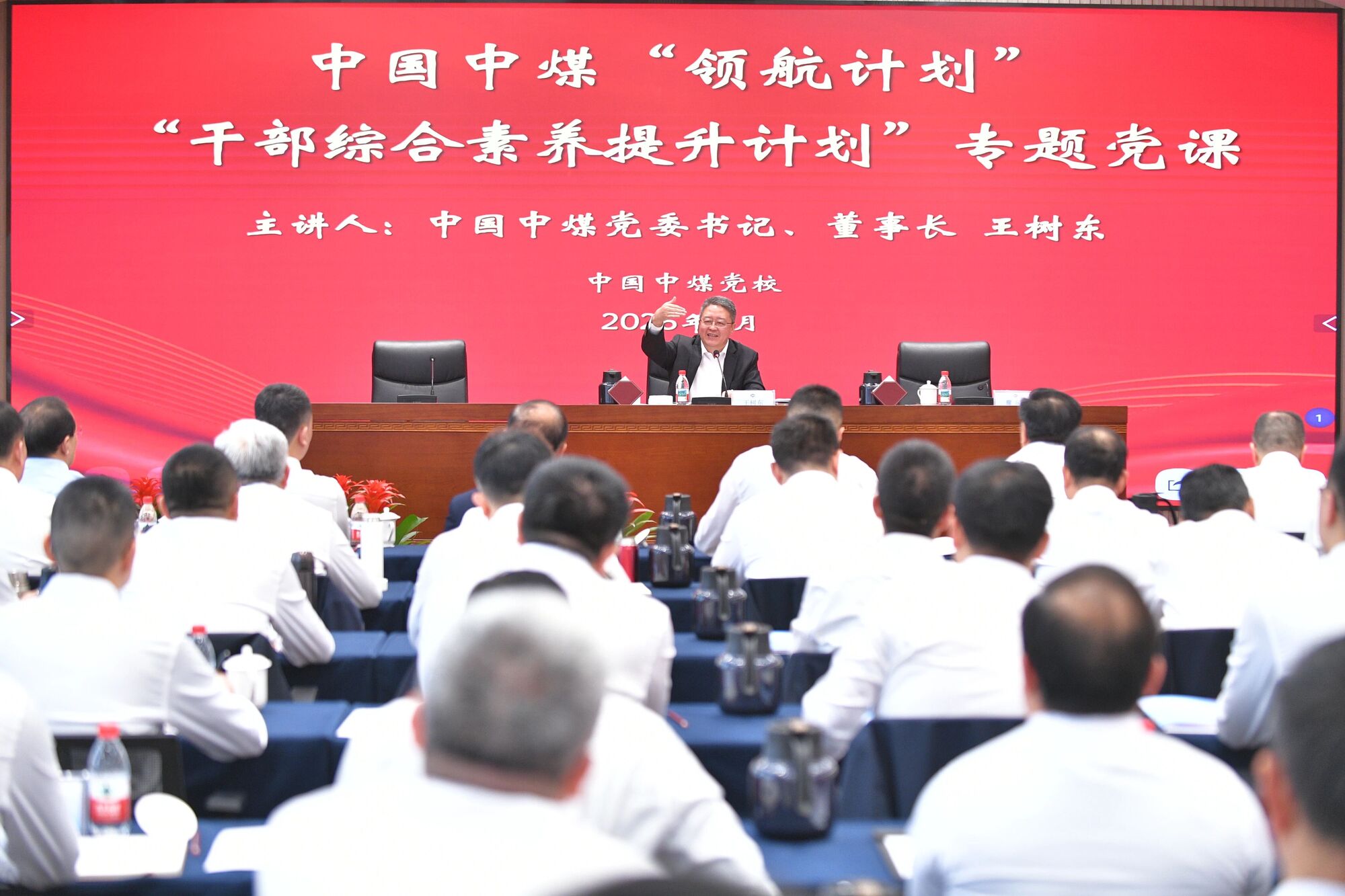 王树东带领培训班学员重温学习了习近平总书记关于国有企业改革发展和党的建设等重要论述和重要指示批示精神,深入分析了当前宏观经济与能源行业形势,并结合集团公司发展实际,重点阐述了“十五五”发展思路与战略举措,对加强干部队伍建设提出了明确要求。强调要把握发展大势,坚定发展信心,扎实推进“存量提效、增量转型”发展思路,深入践行“两个联营+”模式,加快构建“两个对冲”机制,持续推进绿色低碳转型,坚决扛起保障国家能源安全的政治责任,积极助力“双碳”目标实现,为加快建设能源强国、开创中国式现代化建设新局面贡献力量。要牢固树立“为生存而创新”的紧迫意识,抢抓战略机遇,创新发展理念,坚定不移走好煤炭安全清洁高效利用和高端化发展之路。要深化改革攻坚,坚持动真碰硬,持续优化业务流程、清理无效环节、精简冗余岗位,全面提升企业运营效率与发展效益。要厚植干事创业、勇于担当、攻坚克难的情怀,树立和践行正确政绩观,坚持实干为要,狠抓工作落实,努力创造经得起检验的业绩。要不断提升学习、调查研究、科学决策、工作执行和改革创新能力,增强党性修养、道德修养和廉洁意识,心无旁骛干好工作,全力以赴推动集团公司转型发展,加快建设世界一流能源企业。